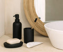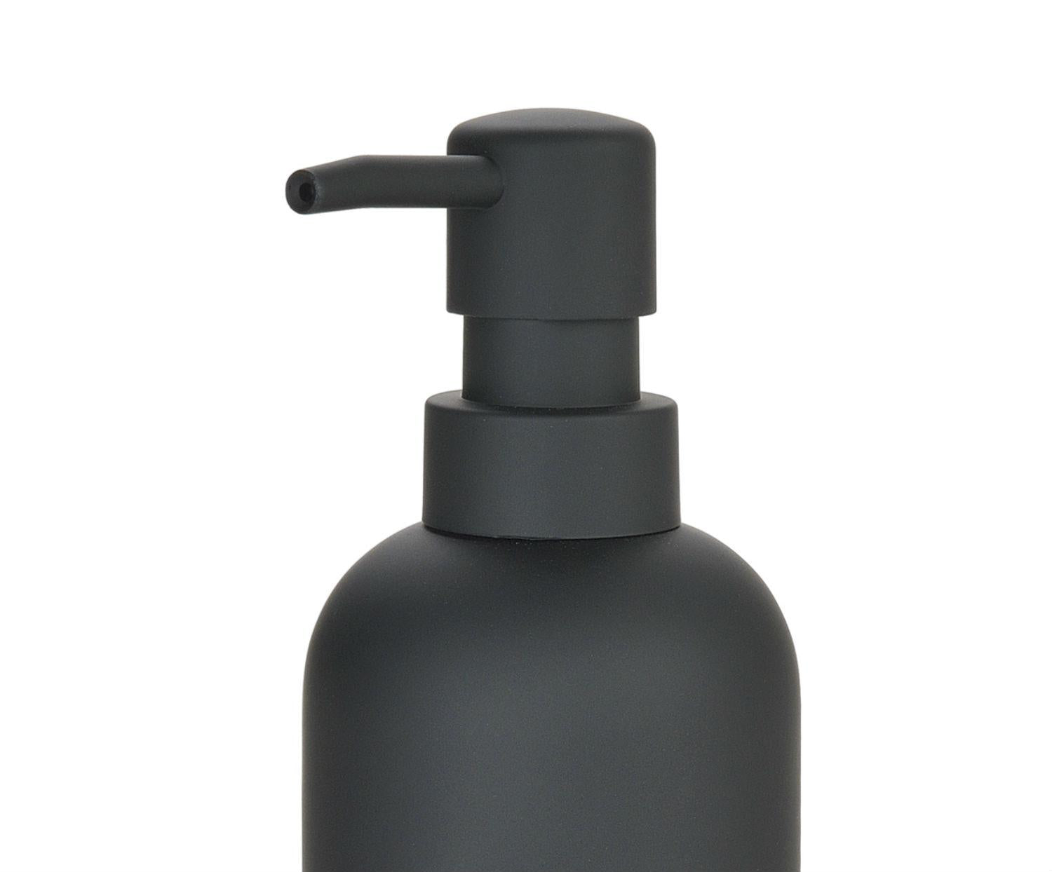 Dispensador de jabón para baño en poliresina negra con acabado mate, diseñado por Andrea House para aportar un toque moderno y funcional al lavabo. Su forma ergonómica y dosificador integrado permiten una dosificación suave y práctica del jabón líquido en el uso diario.