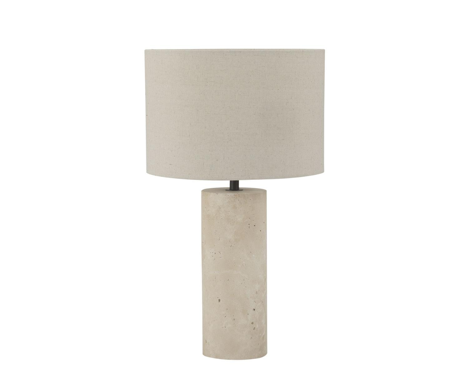 - Materiales naturales y nobles: cuerpo de travertino que añade peso y textura, combinado con una pantalla de lino que suaviza la iluminación.